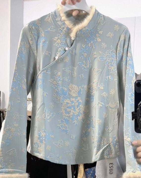 真毛国风毛领显瘦打底衫女秋冬新款复古上衣新中式气质小衫953