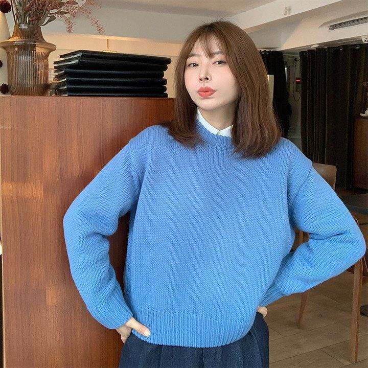 爱si这个蓝~333sss春秋加厚保暖圆领套头毛衣女短款上衣156小个子