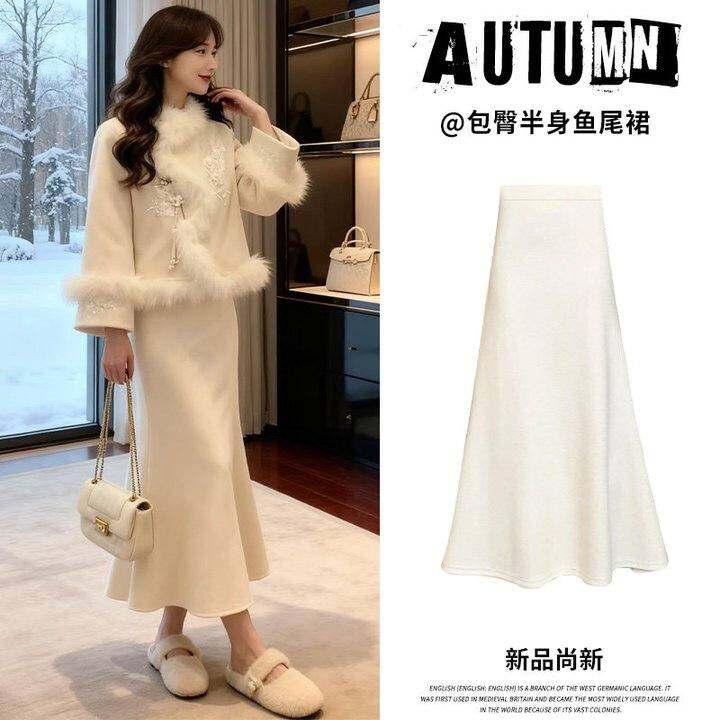 白色针织鱼尾裙女秋冬季长款2025新款高腰显瘦a字毛呢包臀半身裙