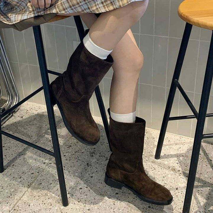 韩版手工烟筒靴女2025秋冬新款真皮靴子中筒靴复古直筒骑士靴单靴