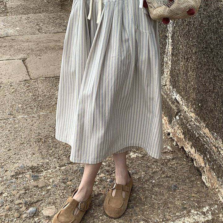 播言法式高级感宽松棉麻条纹阔腿裙裤女慵懒风高腰显瘦A字七分裤