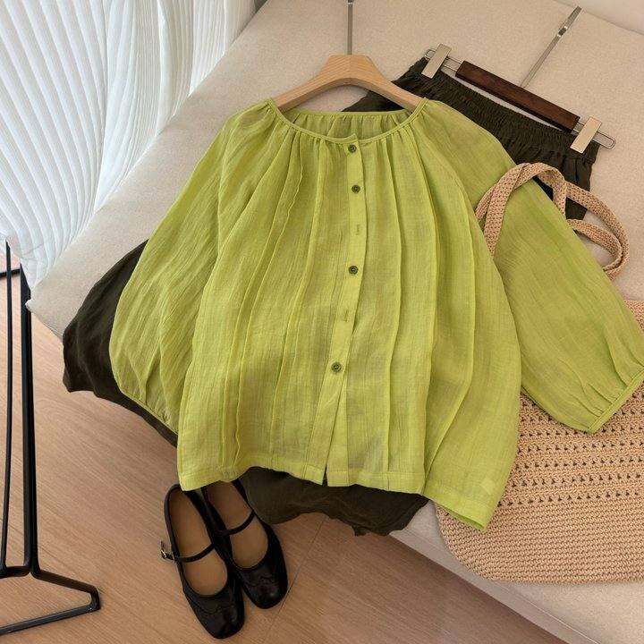 元气治愈嫩绿色!工艺皱酵洗天然苎麻圆领九分袖上衣女2025夏自制