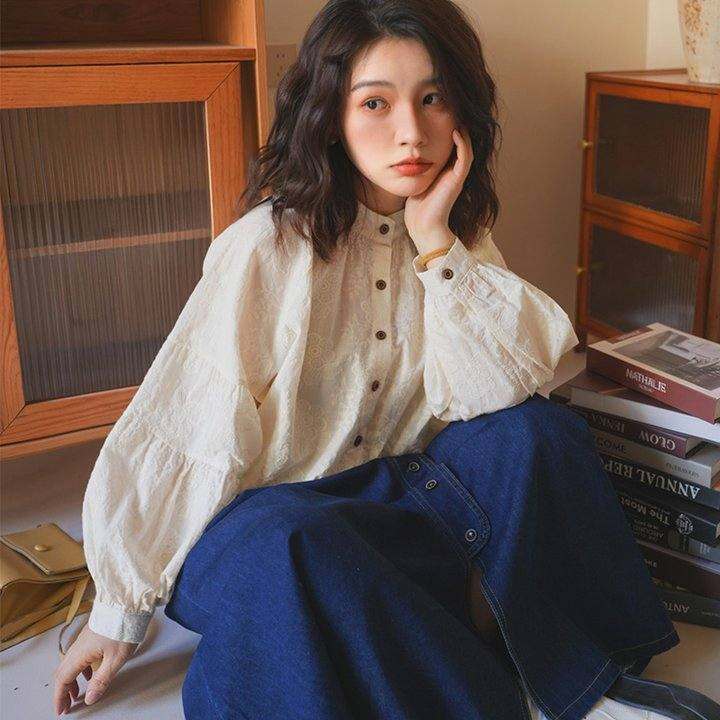 设计感法式纯色立领蕾丝长袖衬衫女春秋新款高级感泡泡袖洋气上衣