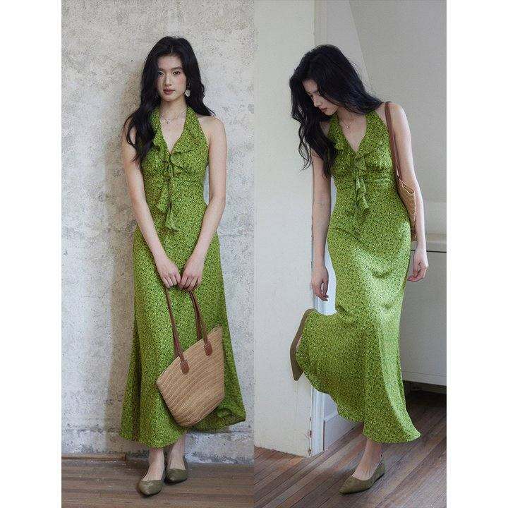 贰羊设计【春枝】法式度假绿色碎花挂脖连衣裙女v领无袖吊带长裙