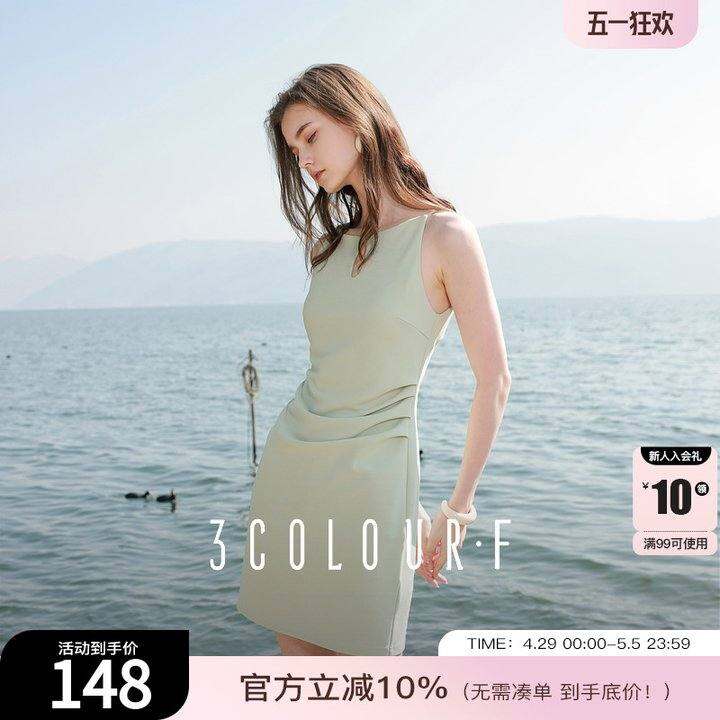 三彩独醒2025夏季新款优雅连衣裙一字领吊带裙收腰修身短裙F