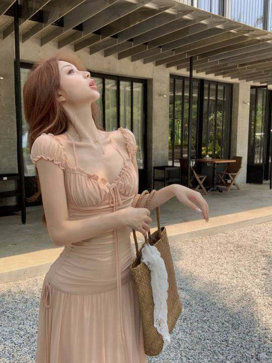 法式温柔挂脖短袖连衣裙女夏季度假褶皱长裙方领收腰显瘦a字裙子