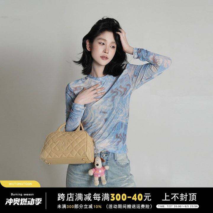 吴童童蓝色扎染网纱长袖T恤女夏季新款韩系修身防晒圆领罩衫上衣