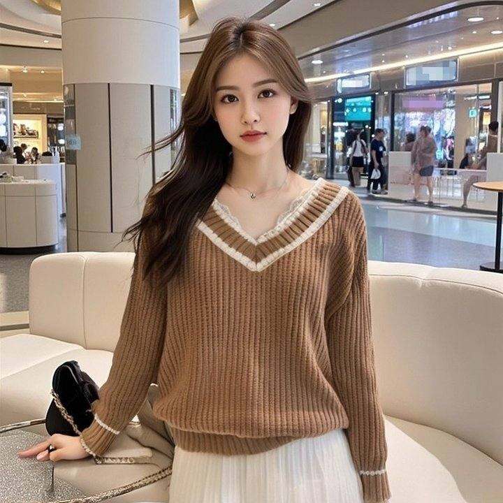 外贸日系少女学院风宽松大毛衣慵懒风粗毛线V领套头衫甜妹上衣女秋冬