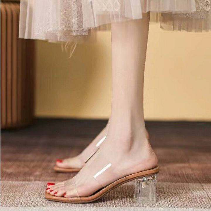 2024年夏季新款水晶透明高跟鞋女方头一字带粗跟凉鞋女外穿