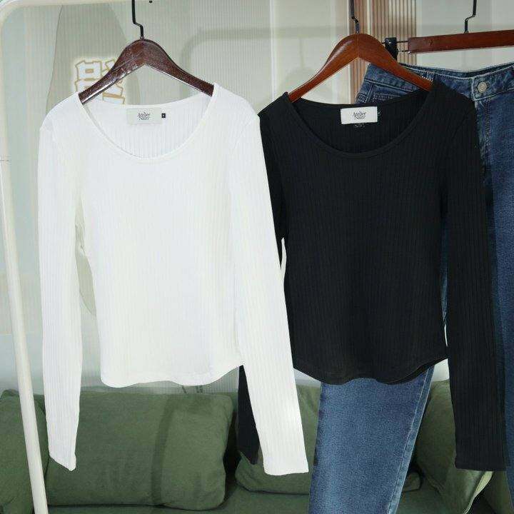 福利特惠秋冬新款大圆领坑条螺纹长袖女士T恤三色基础修身显瘦