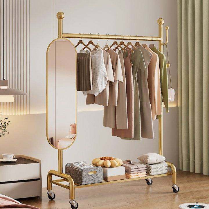 晾衣架落地家用晾衣杆全身镜卧室可旋转移动带挂衣架一体试穿衣镜