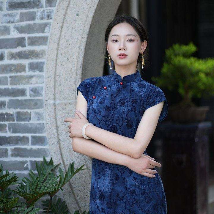 江南絮|蓝色旗袍女新中式改良连衣裙夏大码有弹显瘦日常2025新款