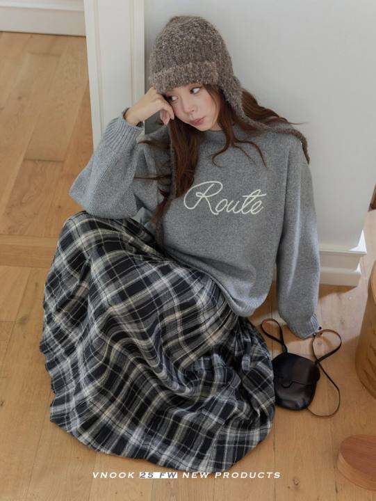 VNOOK覆古格子半裙女2025冬新款气质显瘦磨毛长款褶皱a字半身裙子