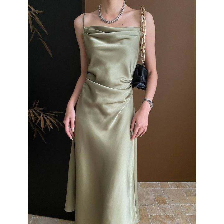法式度假风气质荡领褶皱收腰垂感缎面吊带连衣裙女绿色高级感长裙
