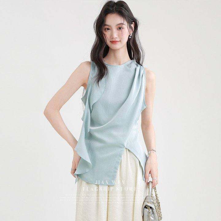 2025夏季新设计感不规则圆领雪纺衬衫女修身显瘦下摆开叉背心上衣