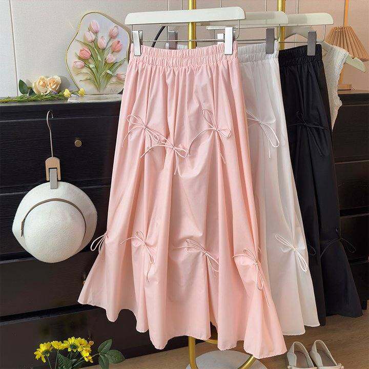 法式甜美蝴蝶结系带半身裙女春季2025年设计感高腰褶皱宽松大摆裙