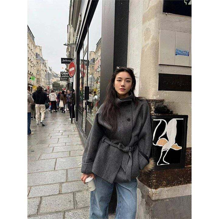 D.L.DONGYUE骆驼绒双面羊绒大衣女短款小个子系带立领毛呢外套