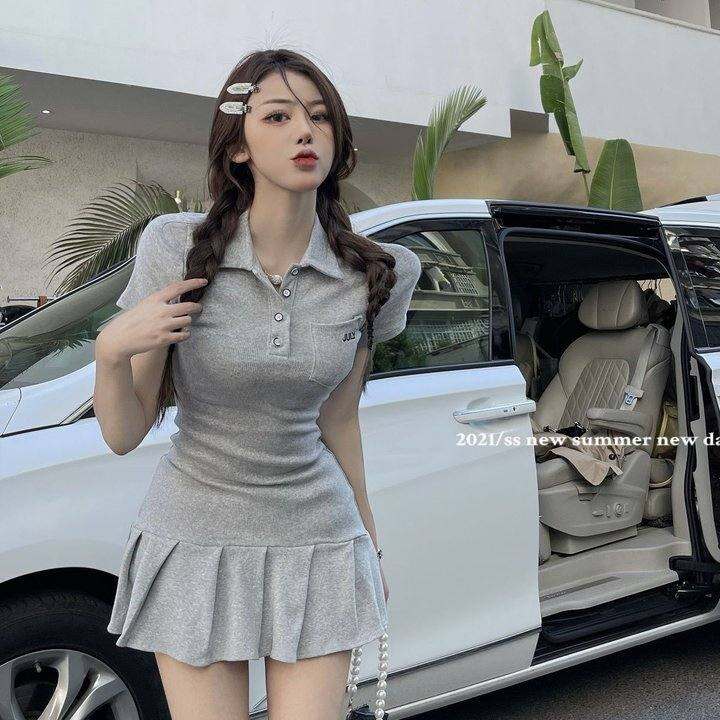 灰色短袖连衣裙2024新款修身显瘦PoLo领气质百褶裙纯欲辣妹风