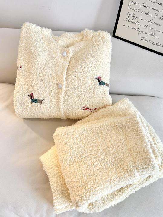 Sin Glee 甜美温柔风可爱小狗针织半边绒睡衣女秋冬加厚保暖套装