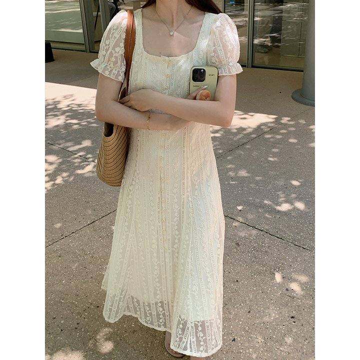 果冻儿 方领法式修身刺绣蕾丝鱼尾裙显瘦中长款连衣裙