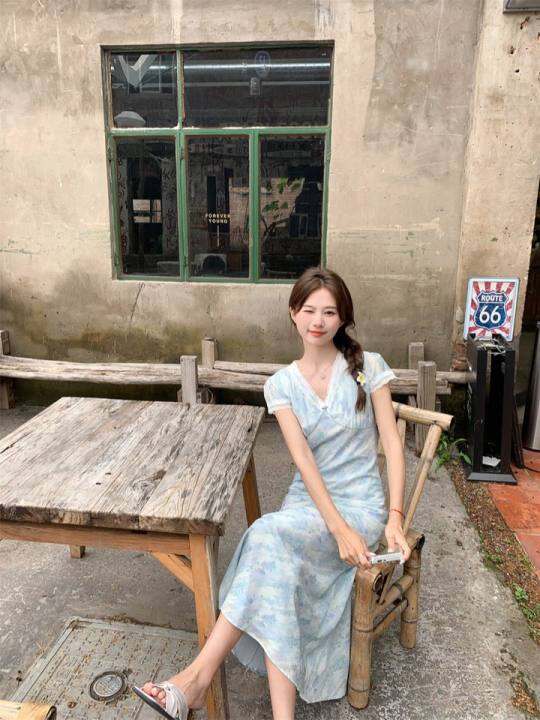 kumikumi温柔风蕾丝边碎花连衣裙女夏季气质修身包臀裙茶歇裙长裙