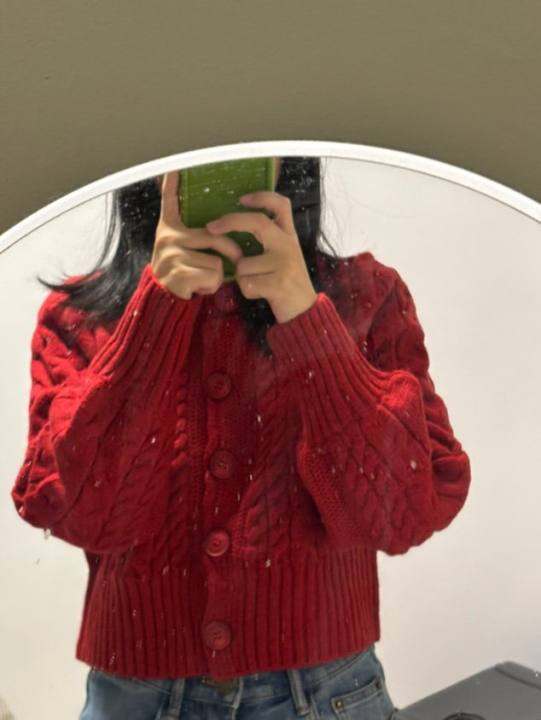 最近刷路口发现的一家店,主打一些快时尚的原单。这件标的UR的开衫毛衣。很正的大红色,虽然只有M码,但因为是短款,所以长度很适合小个子。
