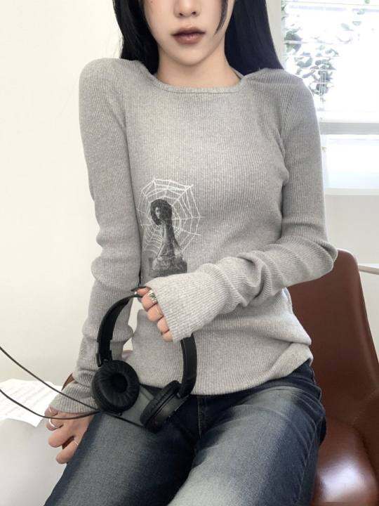 设计感修身长袖针织衫创意印花打底上衣 小众通勤风弹性针织衫
