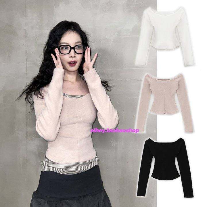 eihey诶嘿中线拼接显瘦纯色露肩短款长袖高级感修身弹力长袖T恤衫