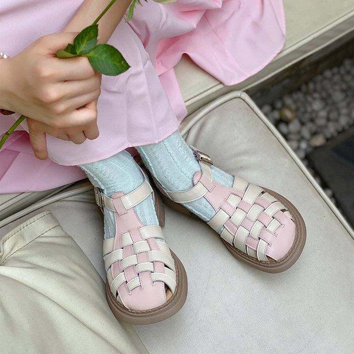 喵唔的天空2024年春夏新款撞色小众编织镂空罗马凉鞋女圆头软萌