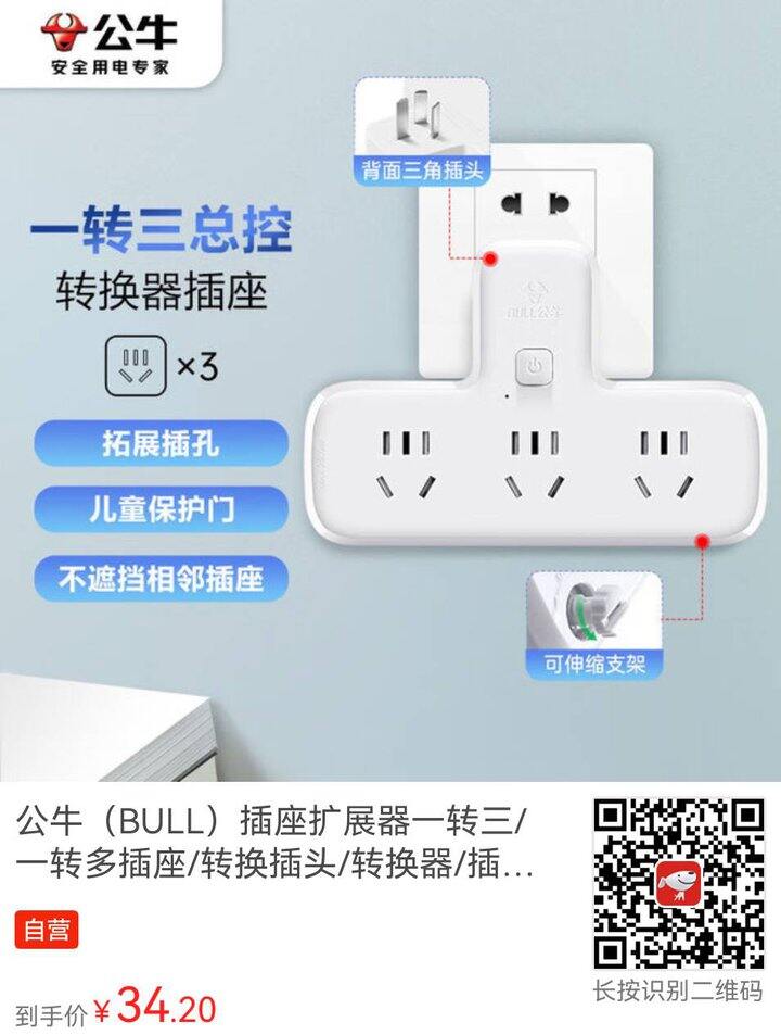 【京东】公牛(BULL)插座扩展器一转三/一转多插座/转换插头/转换器/插排 适用卧室、厨房 品字形 3位总控 GN-9603K