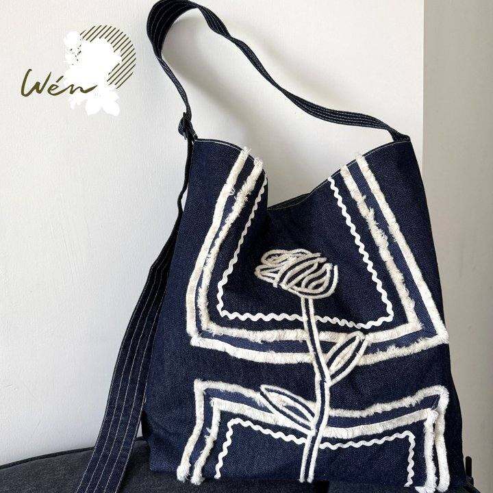 Wén 2025原创夏季牛仔玫瑰系列斜挎包 可调节肩带通勤女士帆布包