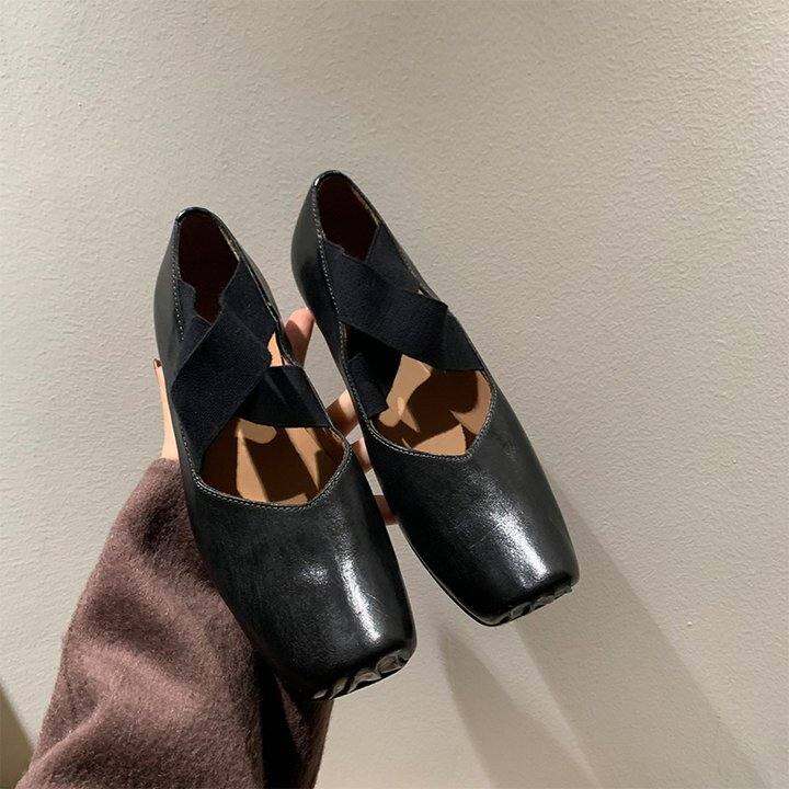 方头猪鼻子芭蕾舞鞋女外穿覆古水洗做旧交叉绑带仙女粗跟单鞋