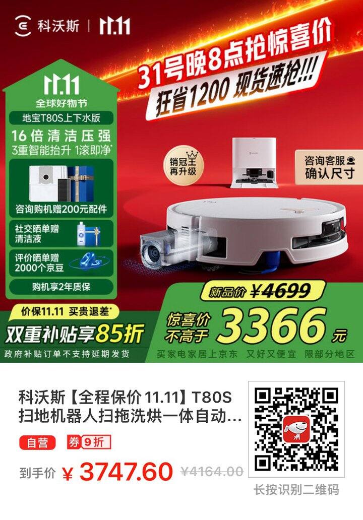 🛒【京东】科沃斯【全程保价11.11】T80S扫地机器人扫拖洗烘一体自动清洗滚筒洗地机器人全自动上下水版国家补贴