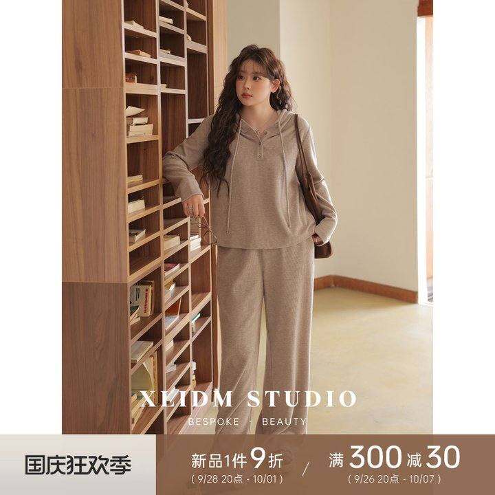 小俪自制大码女装【比例套装】仿羊绒显瘦连帽上衣裤子针织两件套