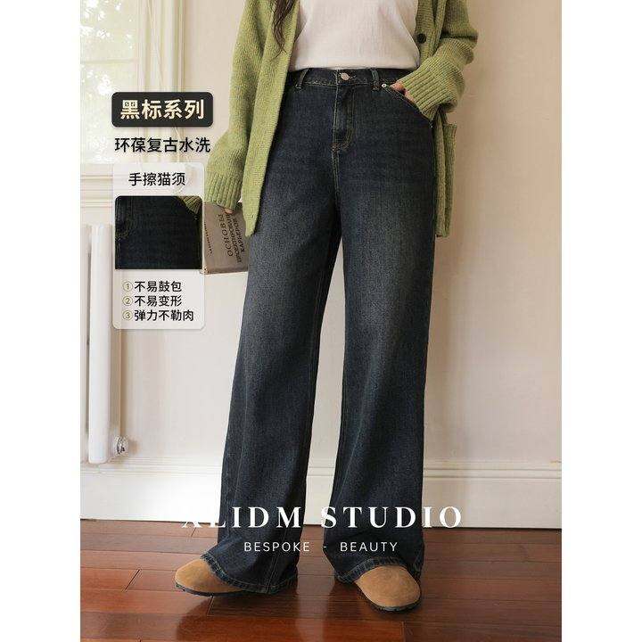 小俪自制大码女装【黑标】百搭微弹复古水洗松紧腰秋冬直筒牛仔裤