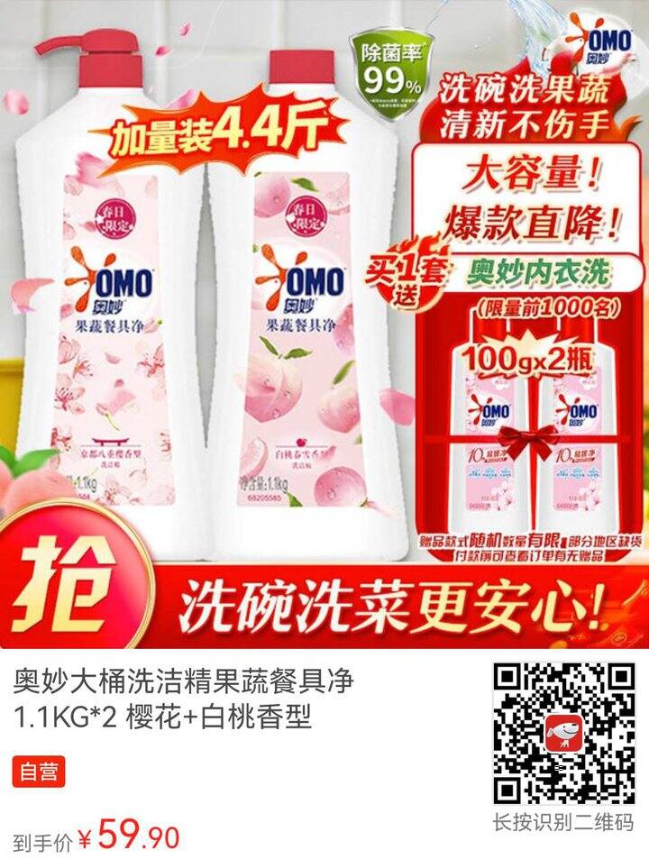 【京东】奥妙大桶洗洁精果蔬餐具净 1.1KG*2 樱花+白桃香型