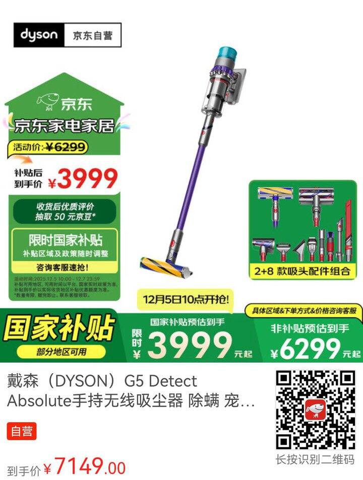 【京东】戴森(DYSON)G5 Detect Absolute手持无线吸尘器 除螨 宠物 家庭适用