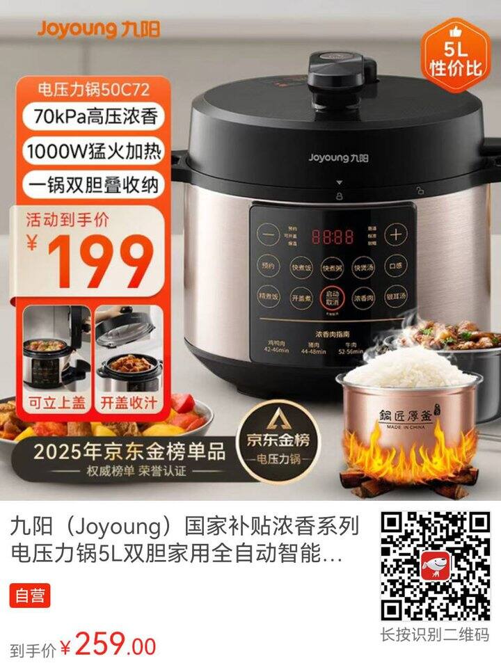 【京东】九阳(Joyoung)国家补贴浓香系列电压力锅5L双胆家用全自动智能预约炖肉煲汤开盖煮猛火Y-50C72电饭煲高压锅4-6人