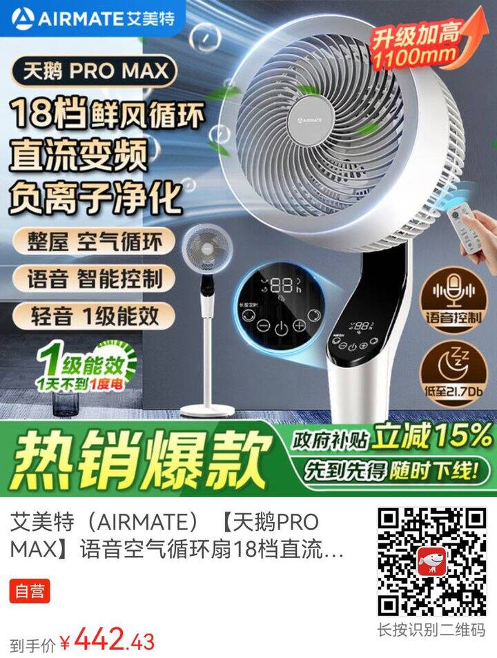 【京东】艾美特(AIRMATE)【天鹅PRO MAX】语音空气循环扇18档直流变频家用电风扇落地扇一级能效负离子净化 FA23-SRDI151