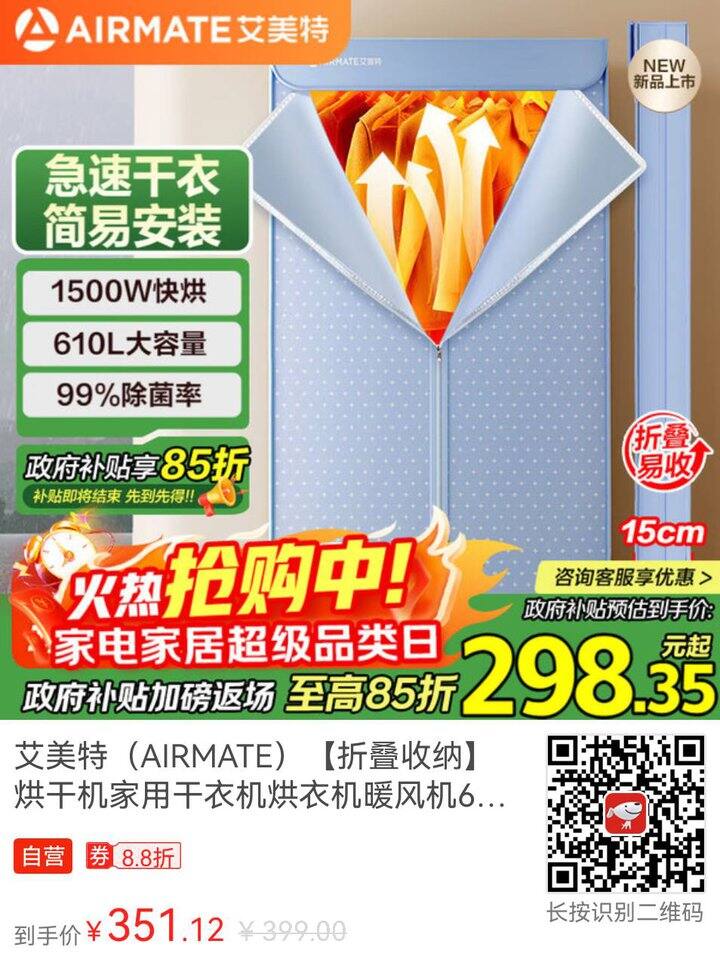 【京东】艾美特(AIRMATE)【折叠收纳】烘干机家用干衣机烘衣机暖风机610L双层大容量婴儿衣物消毒机定时小型风干机