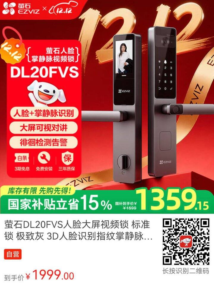 【京东】萤石DL20FVS人脸大屏视频锁 标准锁 极致灰 3D人脸识别指纹掌静脉智能锁 家用半自动猫眼门铃电子门锁
