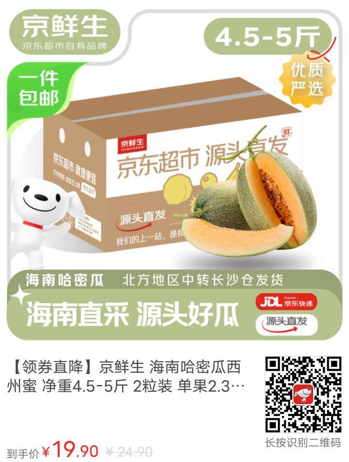 【京东】【领券直降】京鲜生 海南哈密瓜西州蜜 净重4.5-5斤 2粒装 单果2.3斤起 源头直发包邮