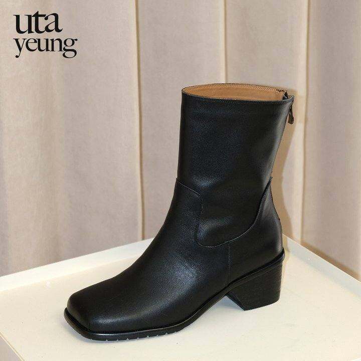 utayeung 黑骑士短靴 原创设计师牛皮真皮短靴女方头战中筒靴子