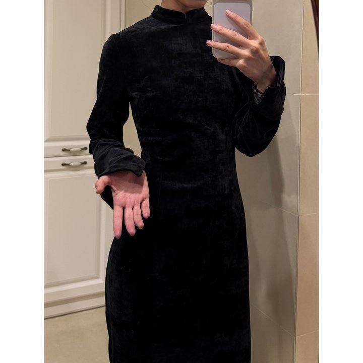 现货LimpOnline|黑色肌理丝绒微弹长袖旗袍可适当偏小拍