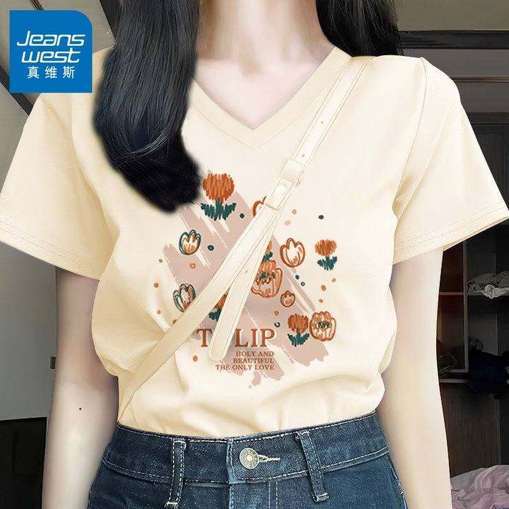 真维斯红色正肩V领短袖t恤女2025新款夏季女装修身显瘦打底上衣X