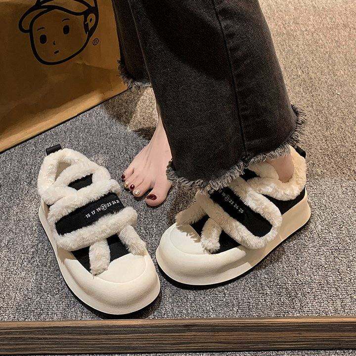 厚底真皮加绒松糕底板鞋2023冬季时尚女鞋魔术贴休闲外穿毛毛鞋子