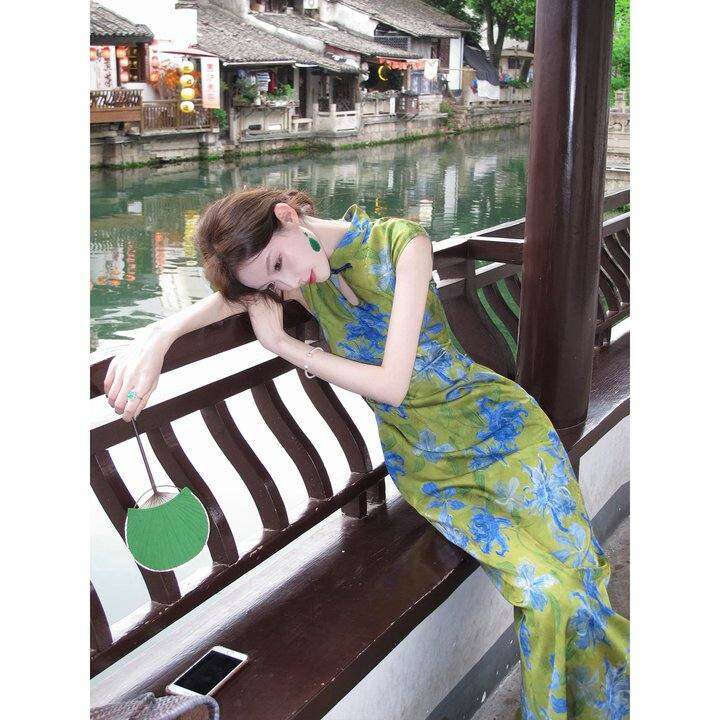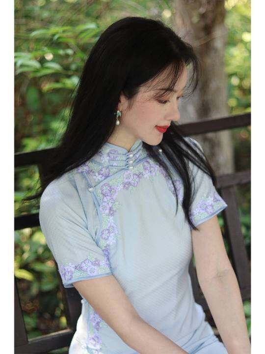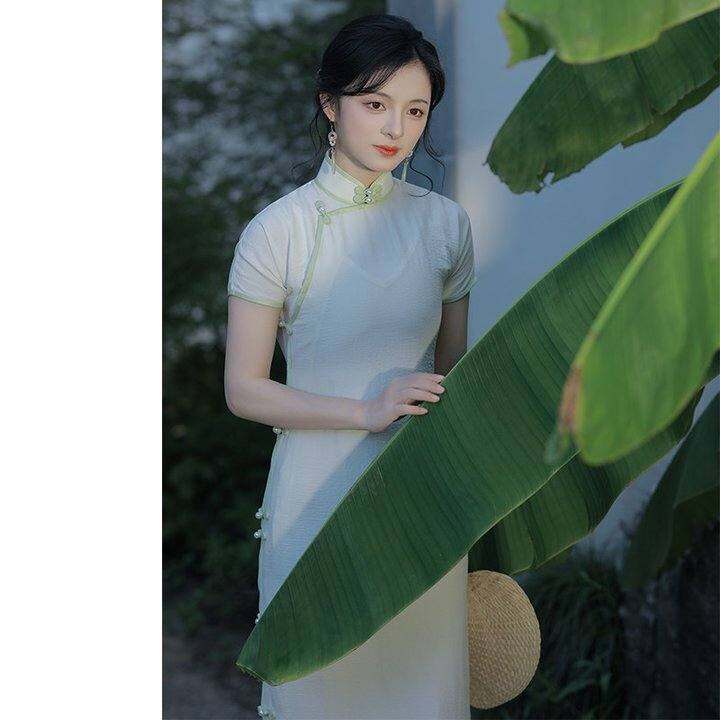 「蜜瓜奶绿」厂襟夏季长款短袖30s旗袍全花扣少女风单层民国立领