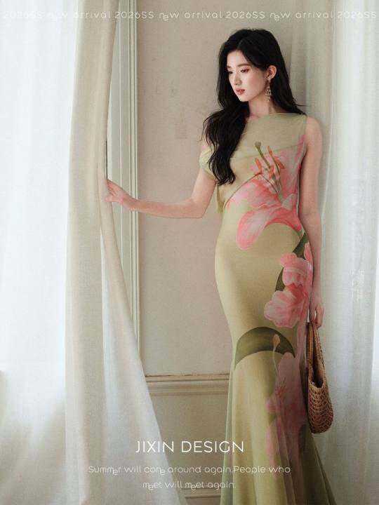 寄信“青萝花信”粉百合花艺术感印花裙弹力网纱修身鱼尾连衣裙