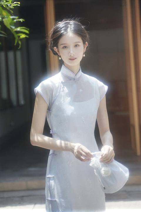 月上紫薇 |新款民国少女欧根纱长旗袍春夏短袖年轻款复古文艺气质