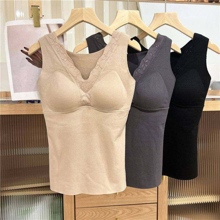 古妃34090羊羔绒花边保暖舒适背心V领发热带胸垫打底秋冬磨毛内衣